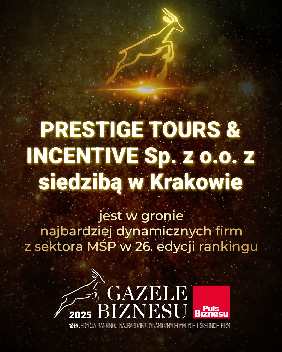 Firma Prestige Tours & Incentive została uwzględniona w rankingu Gazele Biznesu 2025, przygotowywanym od 25 lat przez redakcję Pulsu Biznesu.