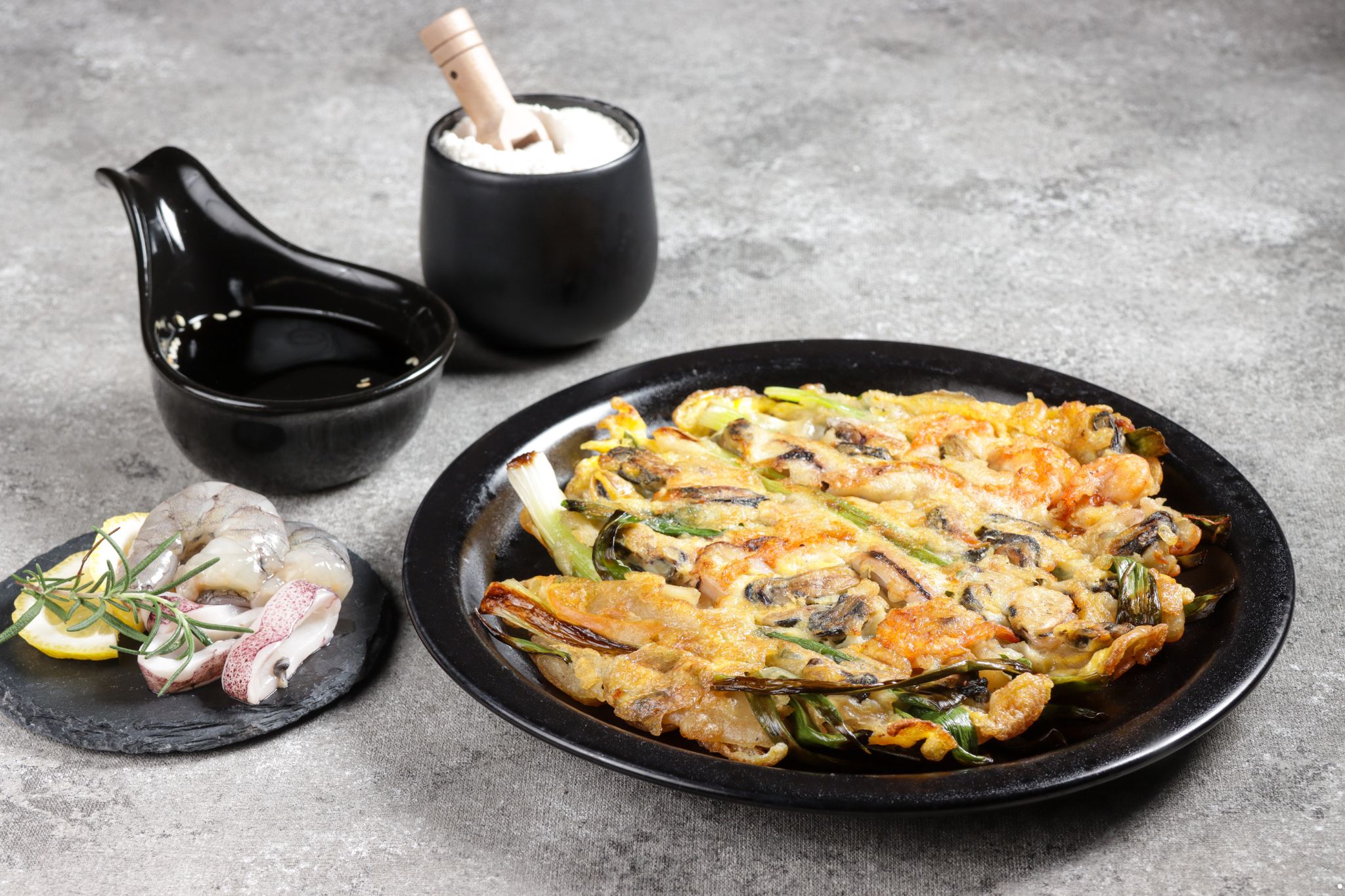 Haemul Pajeon (해물 파전) | Smażony placek z ciasta z cebulką i mieszanką owoców morza. |