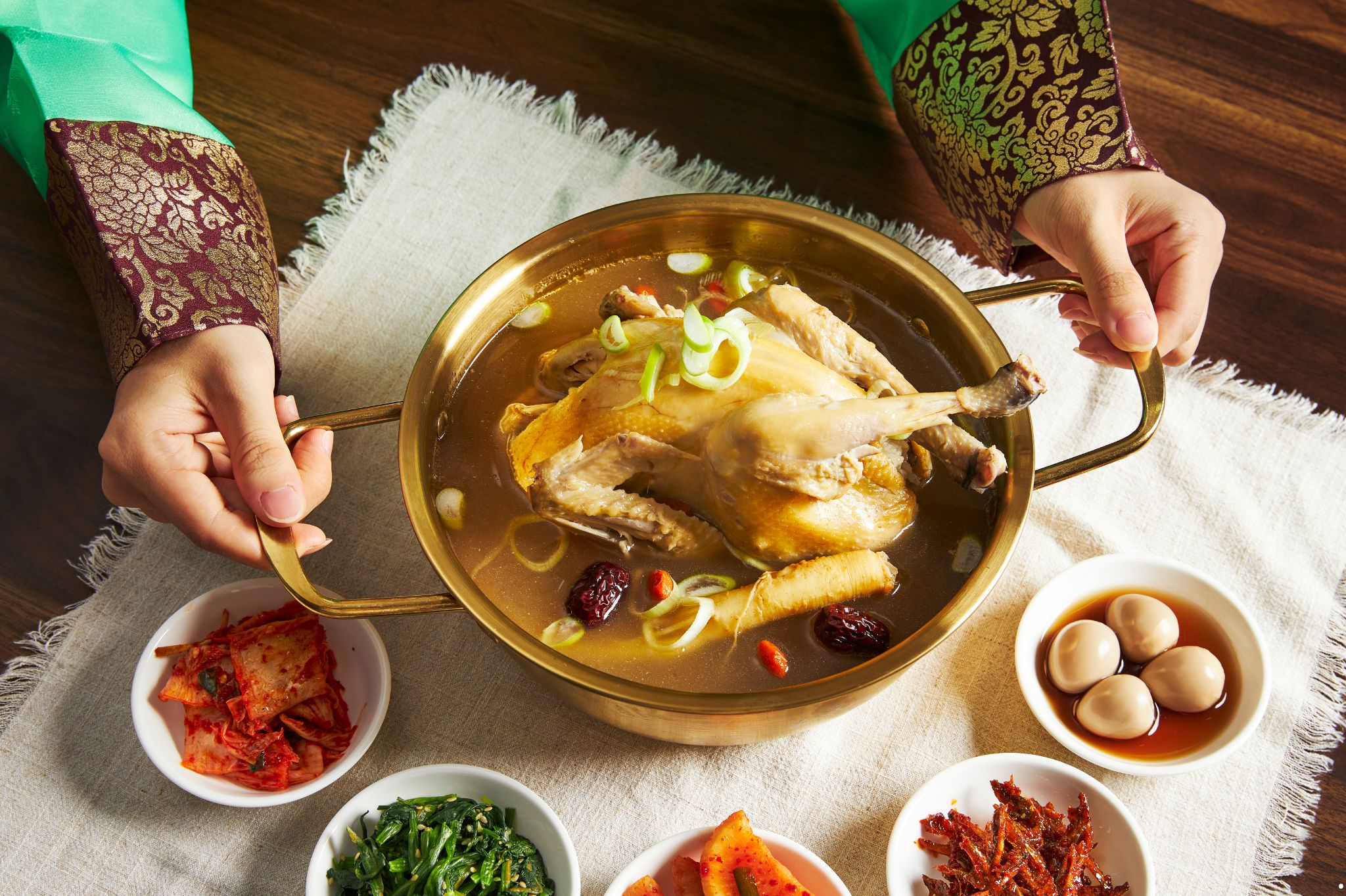 - Samgyetang (삼계탕) – zupa z młodego kurczaka nadziewanego ryżem, czosnkiem i żeń-szeniem