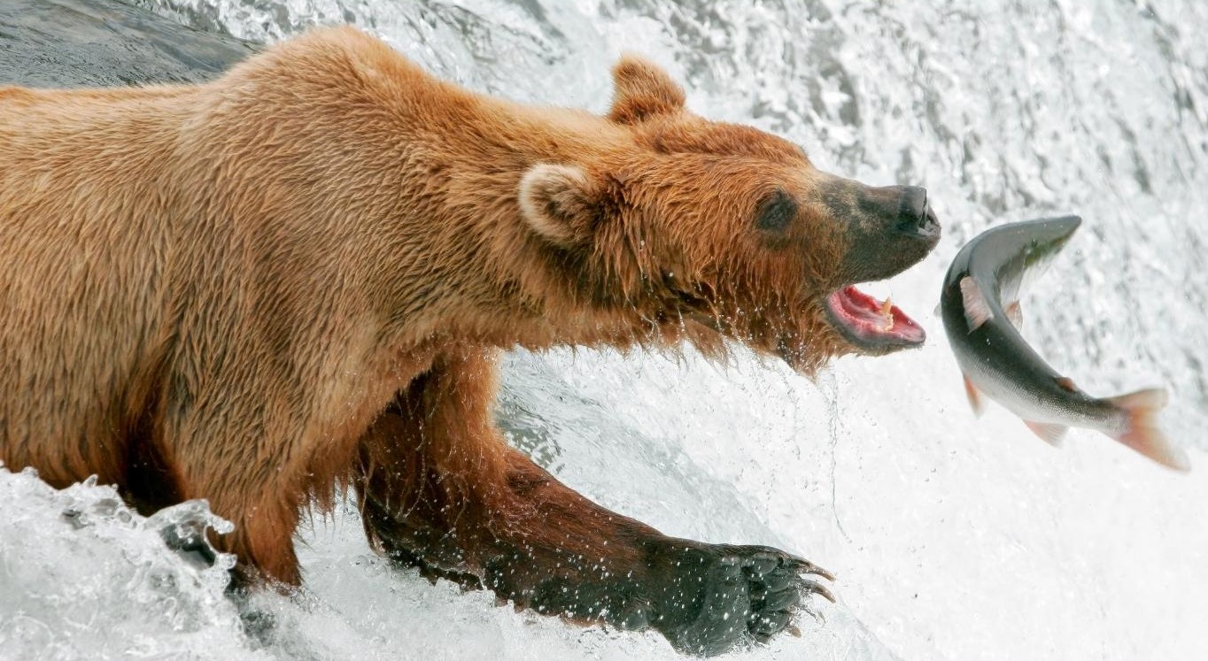 Najbardziej widowiskowe sceny rozgrywają się przy wodospadach i bystrzach, gdzie łososie próbują przeskakiwać przeszkody wodne. Niedźwiedzie wykorzystują naturalne „wąskie gardła” rzek, stojąc nieruchomo w nurcie i chwytając ryby potężnymi łapami lub pyskiem. Co ciekawe, często wybierają tylko najbardziej kaloryczne części — skórę i ikrę — pozostawiając resztę ciała innym zwierzętom.