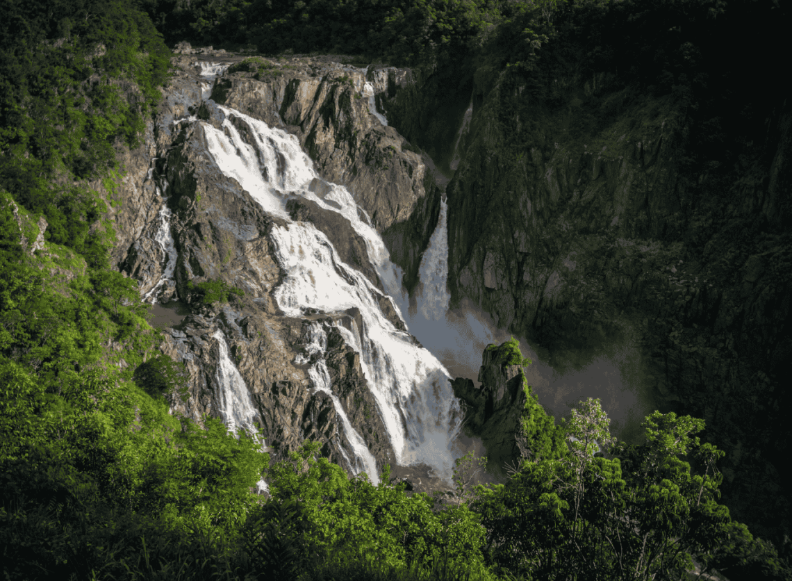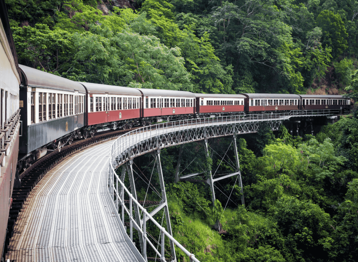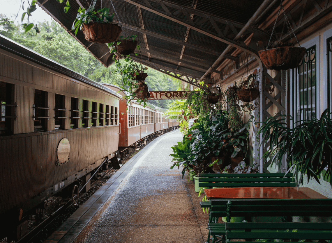 Kolejny dzień pobytu w tropikalnym Cairns. W tym dniu mamy w planie wycieczkę kolejową do pobliskiej Kurandy, leżącej w dochodzących do wybrzeża Wielkich Górach Wododziałowych. Wspinająca się w góry linia kolejowa została zbudowana w celu obsługi kopalni już w XIX wieku, a dziś jest świetną atrakcją turystyczną. Podczas postoju pociągu wychodzimy, by podziwiać wspaniałe wodospady – Barron Falls.