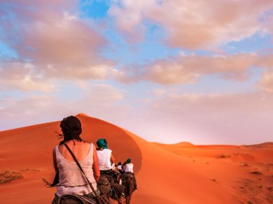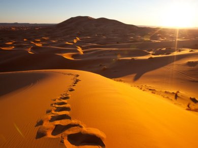 Zaraz po śniadaniu przesiądziemy się na auta terenowe i pojedziemy w głąb Sahary. Przejedziemy poprzez różnorodne oblicza pustyni, od kamienistej hamady do najwyższych w Maroku wydm piaskowych. Znajdziemy się przy słynnym Erg Chebbi, wydmach sięgających 150 metrów wysokości. Zobaczymy tradycyjną kopalnię oraz przy odrobinie szczęścia spotkamy koczowników. Zakwaterujemy się w luksusowych namiotach z łóżkami, pachnącą pościelą i prywatnymi łazienkami. Chętni wyruszą na przejażdżkę na wielbłądach a podziwianie zachodu słońca przewidziane jest na wydmach. Kolacja pod osłoną nieba i kopułą jasno błyszczących gwiazd, naturalnie jeśli księżyc nie zaburzy nam tego spektaklu. Noc na pustyni na długo zapadnie w pamięć. [dystans dnia – ok. 50 km]