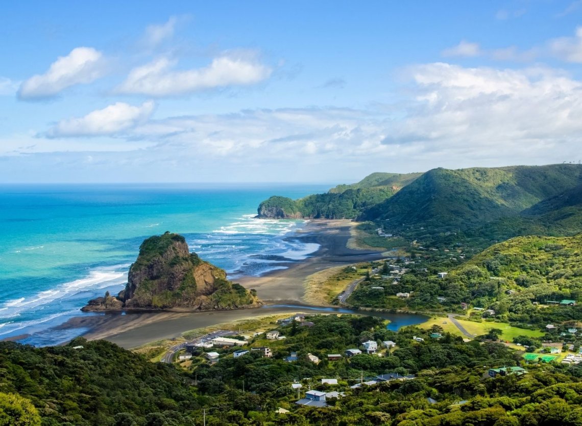 Zaledwie godzinę drogi od tętniącego życiem Auckland znajduje się zupełnie inny świat – dzikie, wulkaniczne plaże zachodniego wybrzeża z czarnym piaskiem, surowymi klifami i potężnym oceanem. Piha Beach – jedna z najbardziej malowniczych i kultowych plaż Nowej Zelandii. Znana z charakterystycznej formacji skalnej Lion Rock i silnych fal przyciągających surferów z całego świata. Spacer wzdłuż plaży, zdjęcia z punktu widokowego. Przejazd przez lasy i wzgórza regionu Waitakere Ranges – tropikalna roślinność, paprocie drzewiaste, wodospady. Muriwai Beach – szeroka, surowa plaża z dramatycznymi klifami, nad którymi znajduje się jedna z największych kolonii głuptaków (gannets) w Nowej Zelandii. Spacer promenadą z platformą widokową tuż nad urwiskiem.