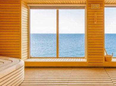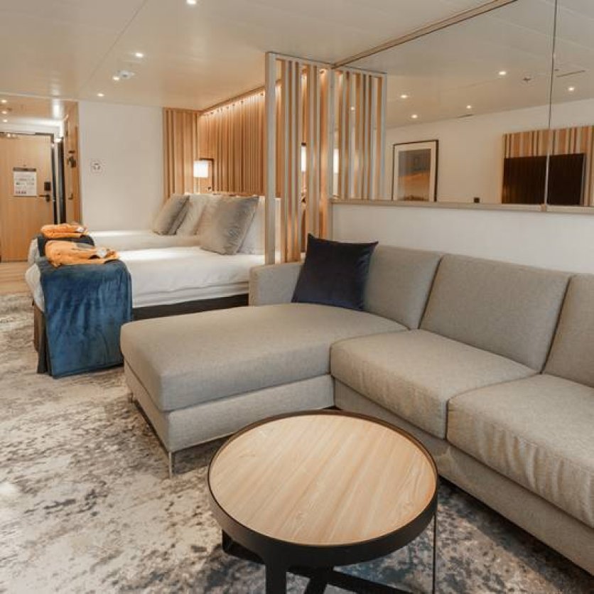 Wyposażenie : jedno podwójne lub dwa pojedyncze łóżka, część wypoczynkowa z rozkładaną sofą, panoramiczne okno, biurko, lodówka, telewizor, prywatna łazienka z prysznicem i podgrzewaną podłogą.